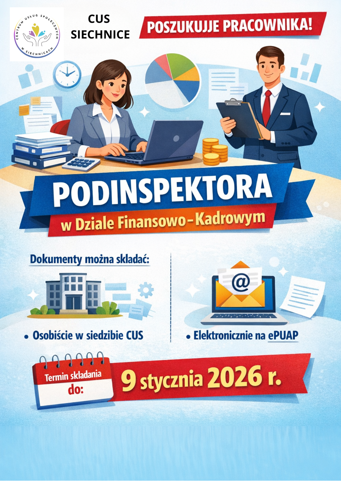Centrum Usług Społecznych w Siechnicach prowadzi nabór na stanowisko PODINSPEKTOR w dziale Finansowo - Kadrowym.
