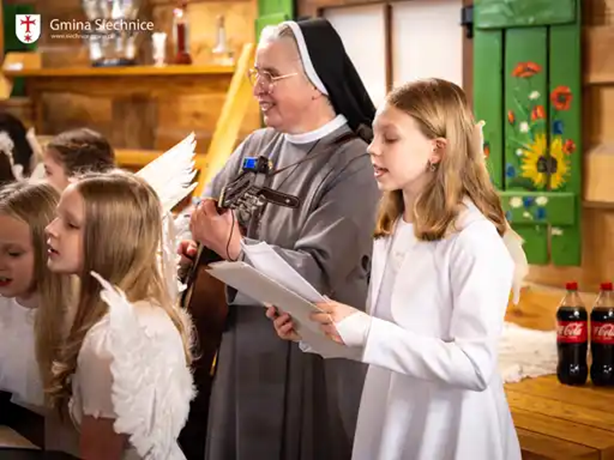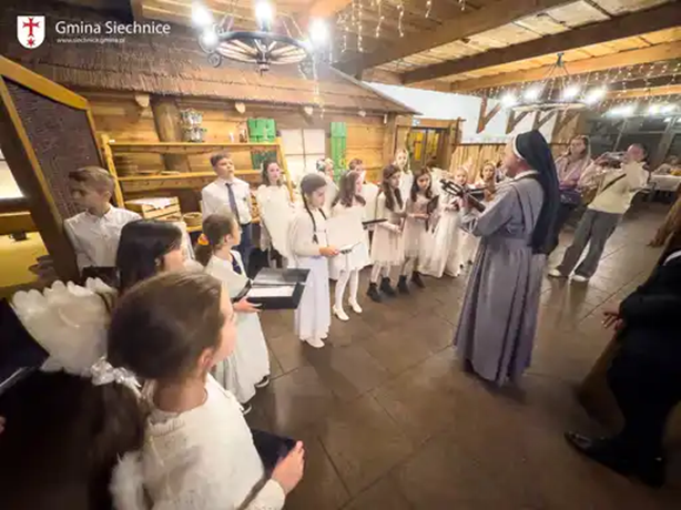 Po powitaniu uczestników odbył się wspólny posiłek wigilijny. Nie zabrakło również pięknych kolęd przygotowanych przez dzieci z pobliskiej szkoły, które wprowadziły wszystkich w świąteczny nastrój. Uczestnicy mieli czas na integrację, rozmowy oraz dzielenie się opłatkiem – gest jedności i wzajemnego wsparcia, tak ważny w tym szczególnym czasie.