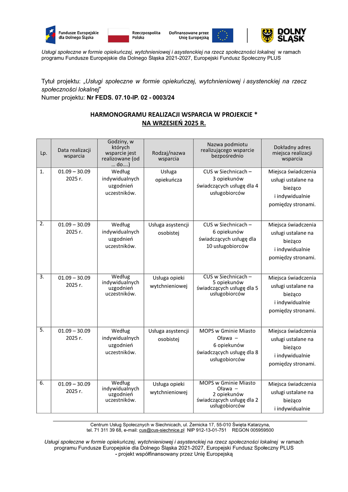 HARMONOGRAM REALIZACJI WSPARCIA W PROJEKCIE - WRZESIEŃ 2025